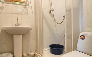холодильник, кровать, тумбочки, душевая кабина, туалет.